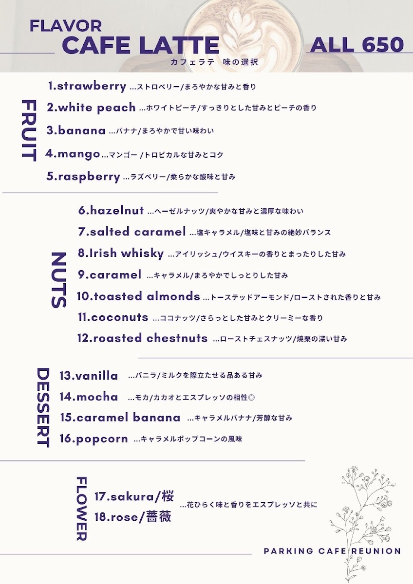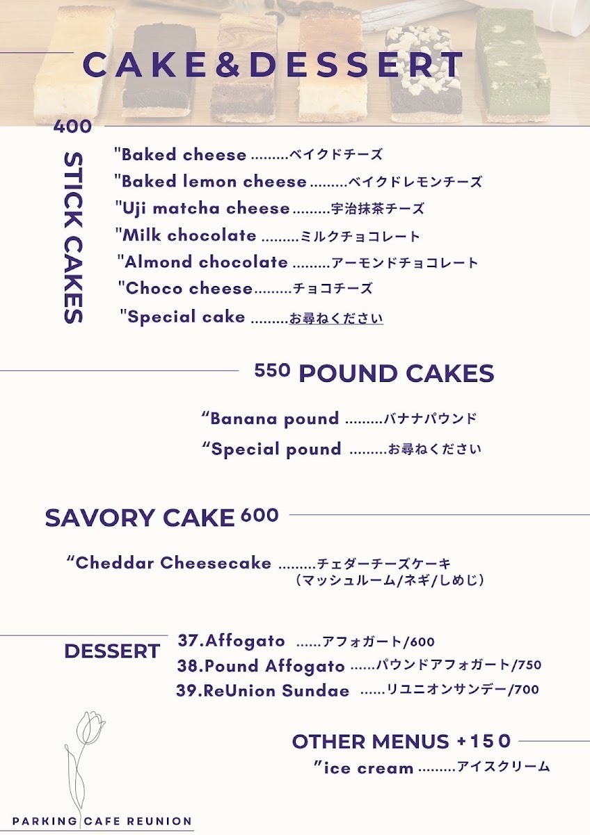 Welcome to Parking Cafe ReUnion, a charming cafe nestled in the greenery of Kyoto's Ukyo Ward. This hidden gem is not just a cafe; it’s a delightful experience. The menu features an array of exquisite offerings, highlighting their signature stick cakes, available in mouthwatering varieties such as baked cheese, Uji matcha cheese, and rich chocolate options, each priced at JP¥400. For a more indulgent experience, try the pound cakes or the luscious affogato at JP¥600, or treat yourself to the unique ReUnion Sundae at JP¥700.